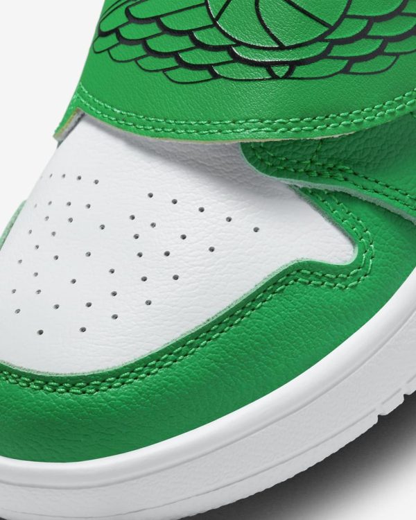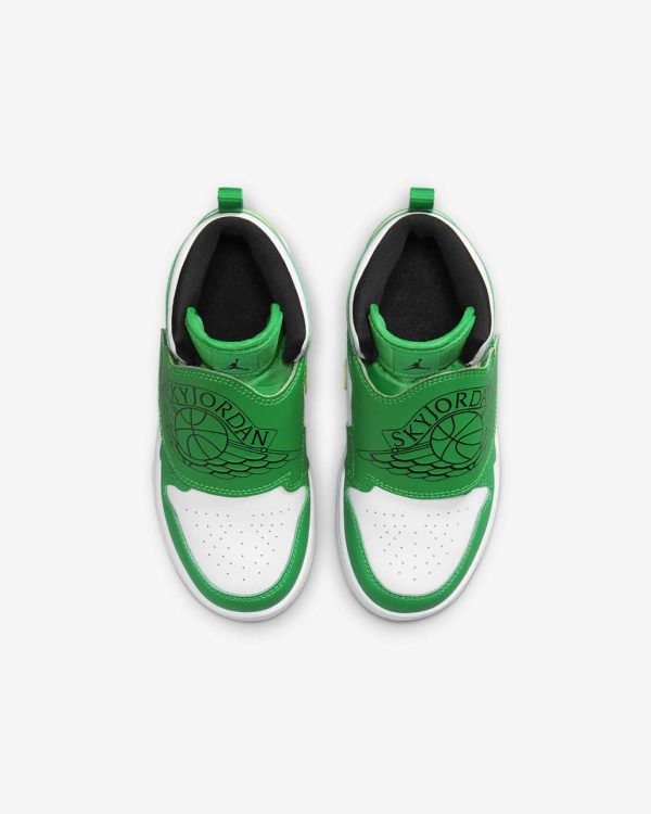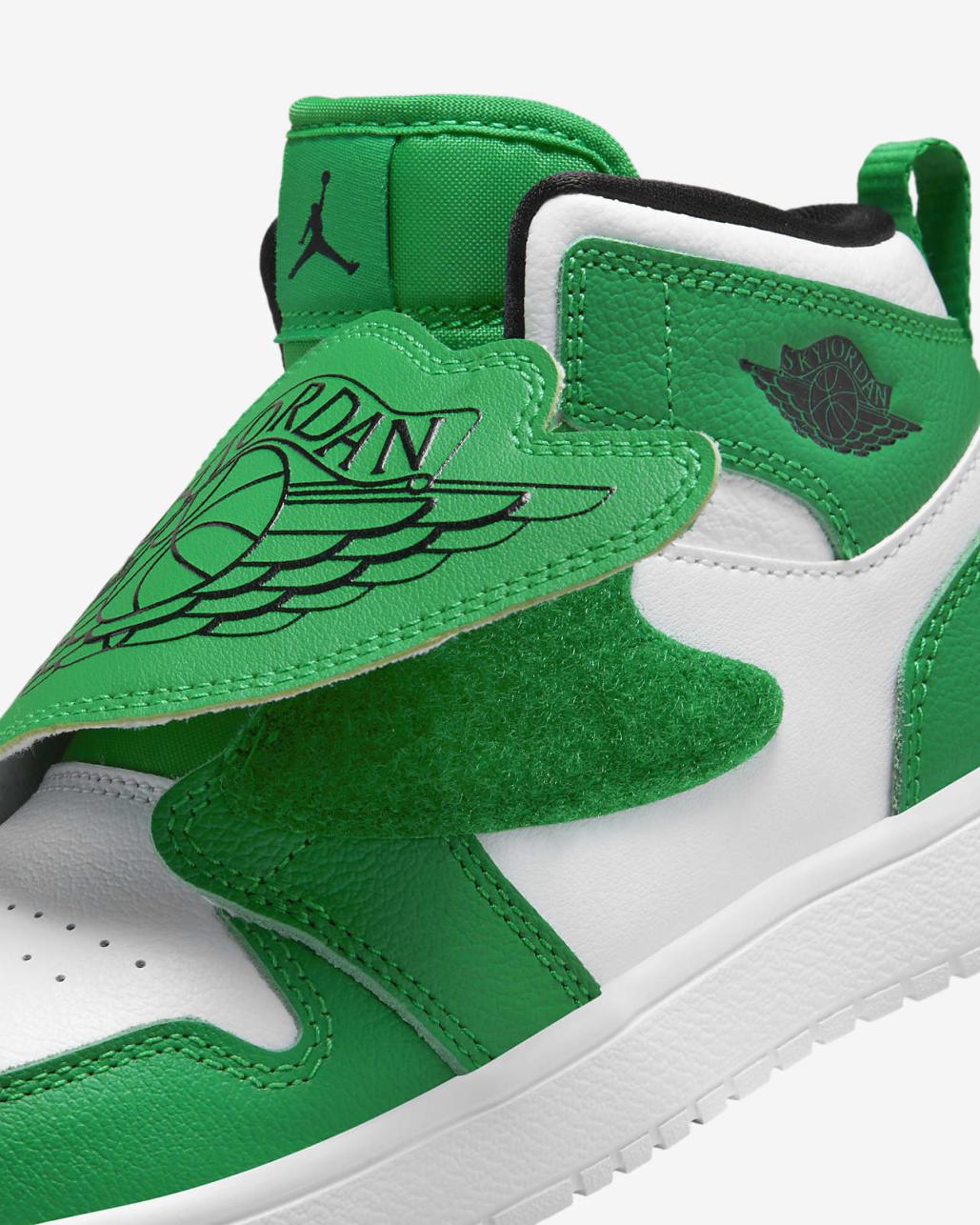 - A "Sky Jordan" logo on front doubles as a hook-and-loop strap to secure the fit.
