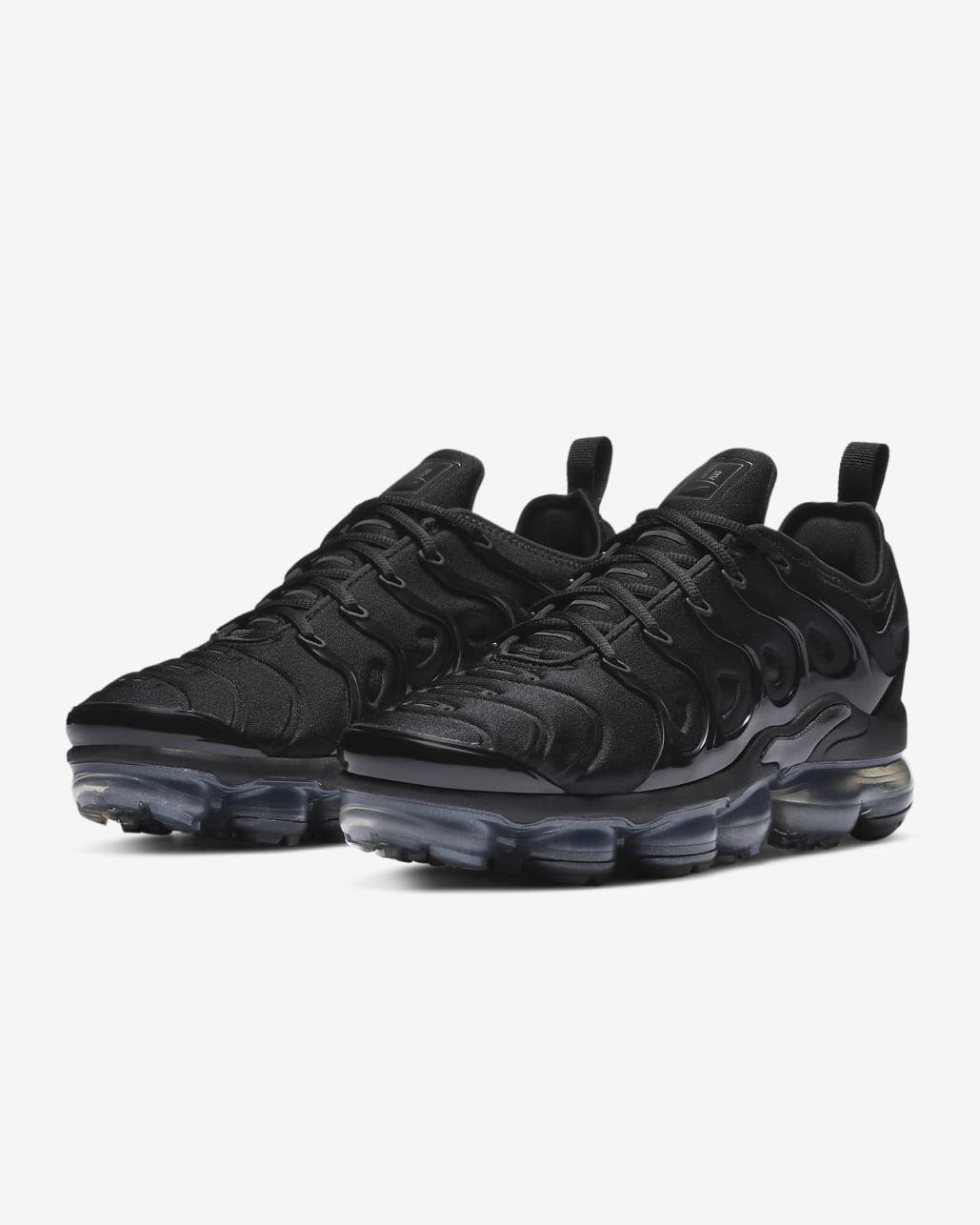 The Nike Air VaporMax Plus looks to the past and propels you into the future. Made with at least 20% recycled material by weight, it keeps the future in mind while including design elements from the '98 Air Max Plus. Revolutionary VaporMax Air technology provides comfort and a modern look, while the floating cage, heel logo and iconic whale tail midfoot shank add heritage style. A sleek all-black upper and black rubber pods on the outsole show off your dark side.